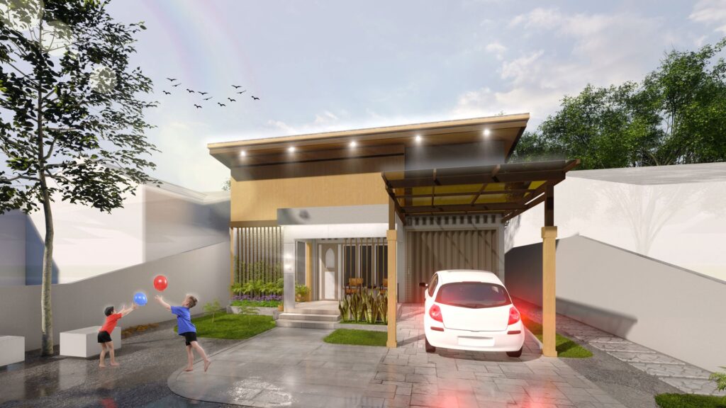 Berangkat dari keinginan owner untuk memiliki hunian yang tampil berbeda dari rumah-rumah di sekitarnya. Dengan luas lahan yang terbatas, tantangannya adalah bagaimana menciptakan fasad yang tetap kuat secara karakter tanpa terlihat berlebihan. Konsep modern + nature menjadi pendekatan utama dalam perancangan. Elemen kayu dan sentuhan material bernuansa alami dipadukan dengan garis-garis tegas dan komposisi geometris yang modern. Keterbatasan bidang justru dimanfaatkan sebagai peluang untuk mengeksplorasi detail, tekstur, dan layering fasad agar tampil lebih hidup. Hasilnya adalah tampilan rumah yang terasa hangat, woody, dan tetap modern menciptakan identitas visual yang unik sekaligus menyatu dengan nuansa alam di sekitarnya.