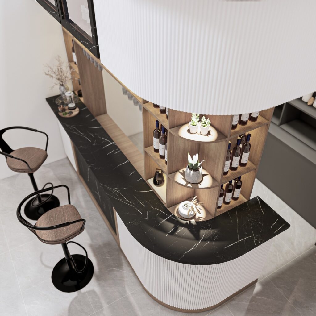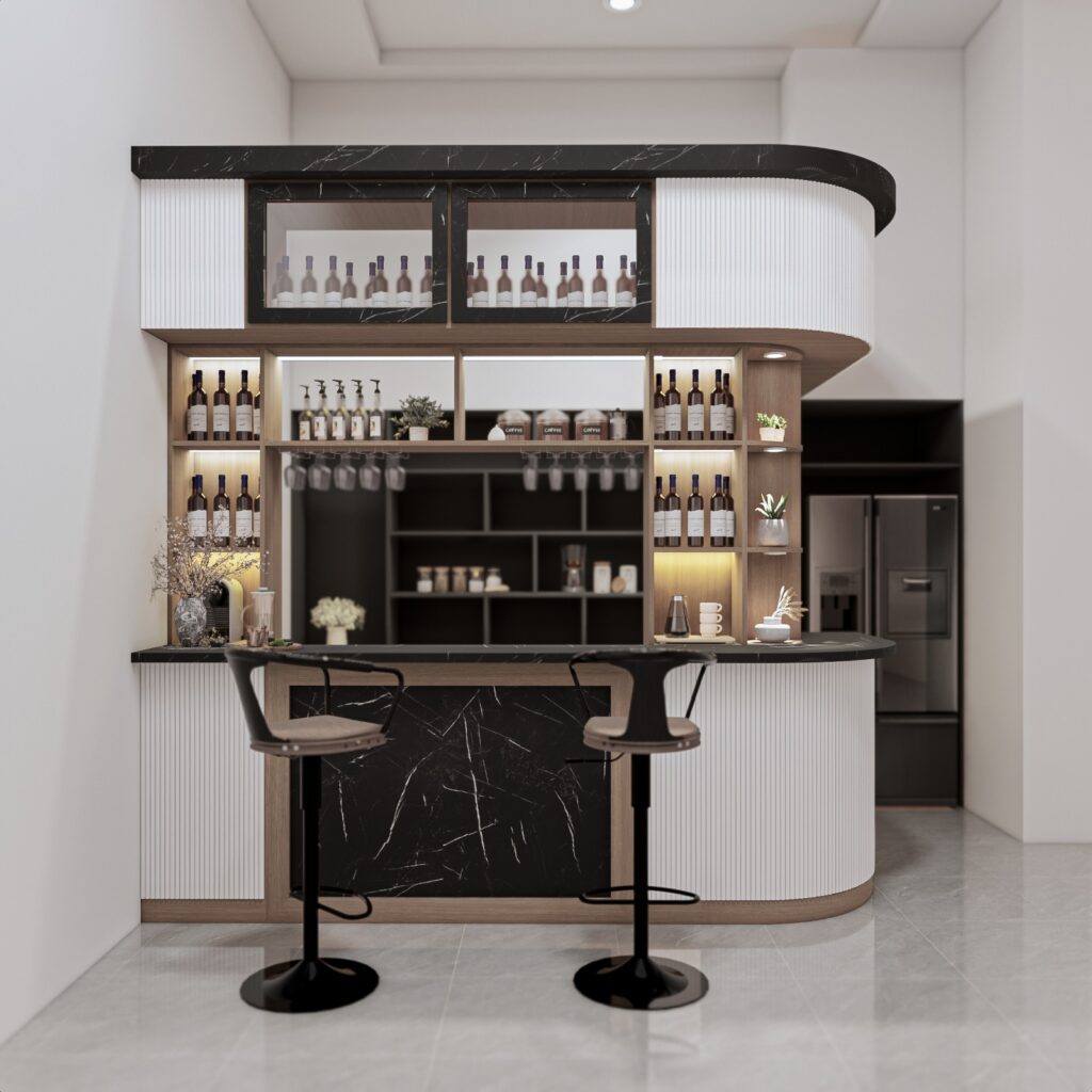 Tata letak dirancang ergonomis dengan area countertop yang cukup luas, rak display untuk koleksi minuman, serta pencahayaan hangat yang memperkuat ambience. Lighting aksen pada area backdrop atau bawah meja bar menambah kesan dramatis namun tetap nyaman untuk digunakan dalam berbagai suasana baik untuk bersantai sendiri maupun berkumpul bersama keluarga dan teman.