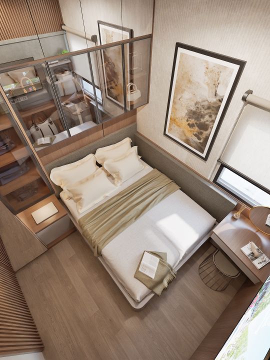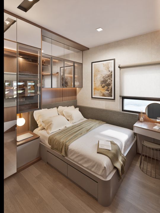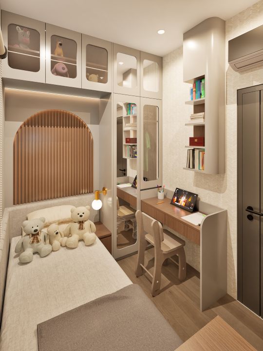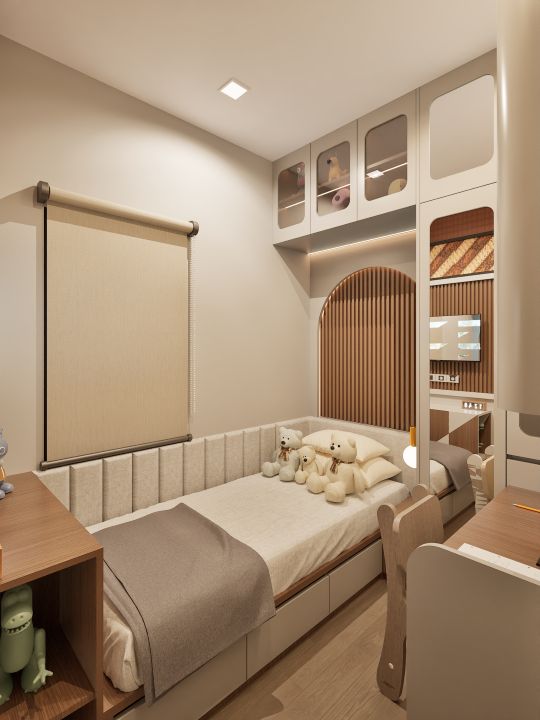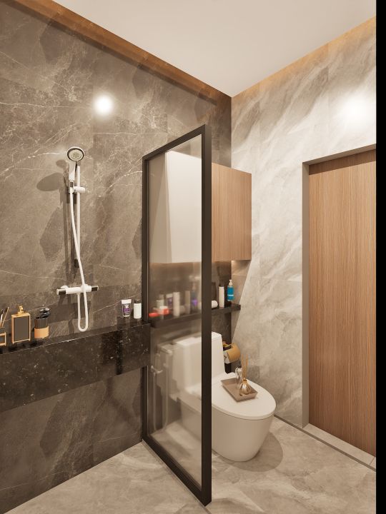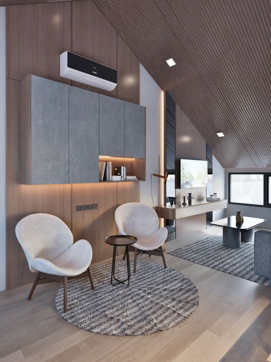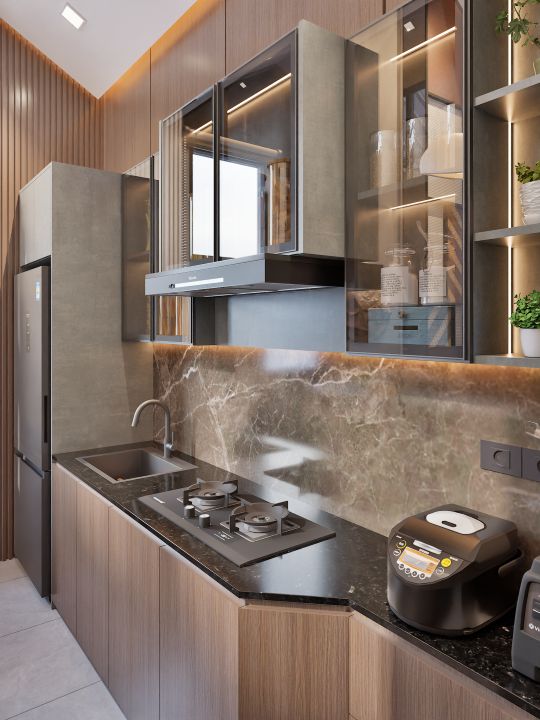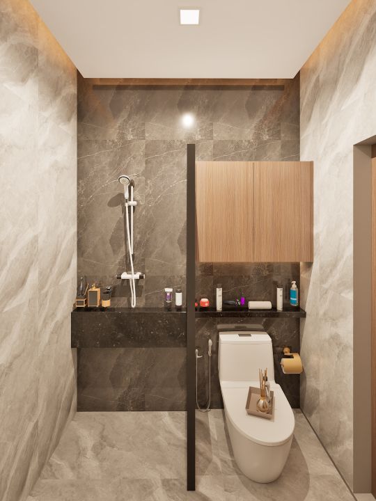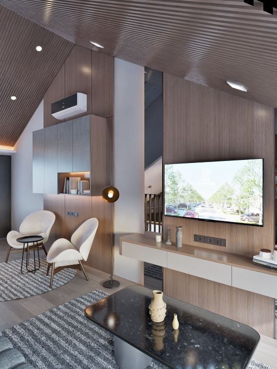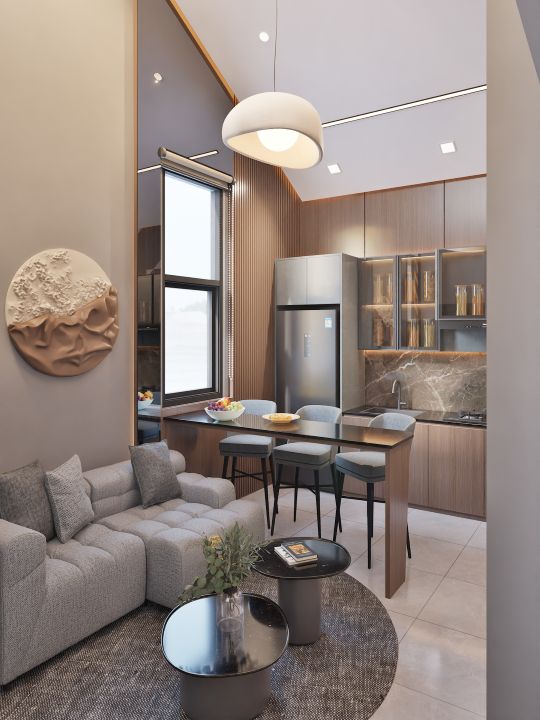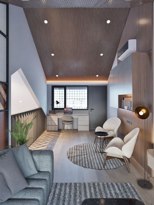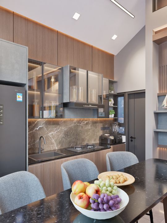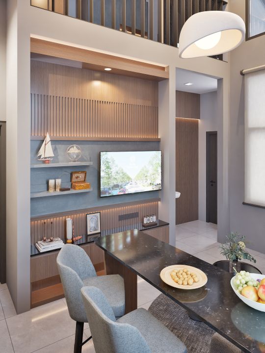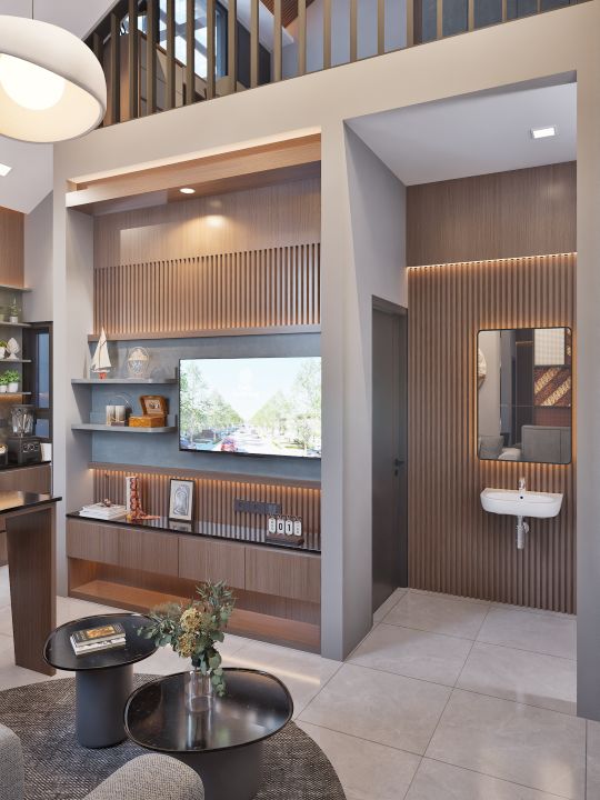 Material mahoni menjadi elemen utama yang mempertegas identitas ruang, menghadirkan tekstur alami sekaligus nuansa mewah yang timeless. Dipadukan dengan finishing abu gelap dan cokelat pekat, interior ini tampil solid dan sophisticated. Permainan warna gelap tersebut tetap terasa seimbang berkat pencahayaan hangat (warm lighting) yang dirancang menyebar dan lembut, sehingga ruang tidak terasa suram, melainkan intim dan nyaman.