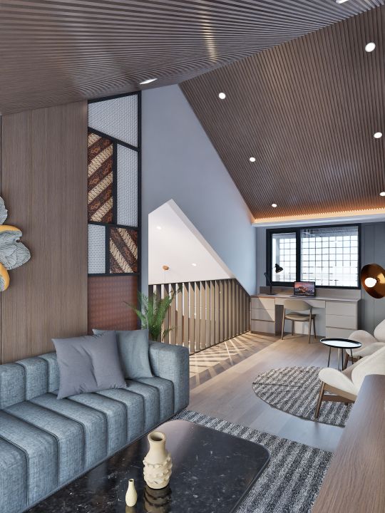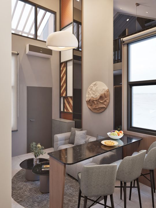 Ceiling yang tinggi turut memperkuat kesan luas dan lega pada hunian. Proporsi ruang yang vertikal memberikan pengalaman visual yang megah, sekaligus meningkatkan sirkulasi udara dan pencahayaan alami. Kombinasi volume ruang yang lapang dengan tone gelap menciptakan atmosfer yang dramatis namun tetap harmonis.