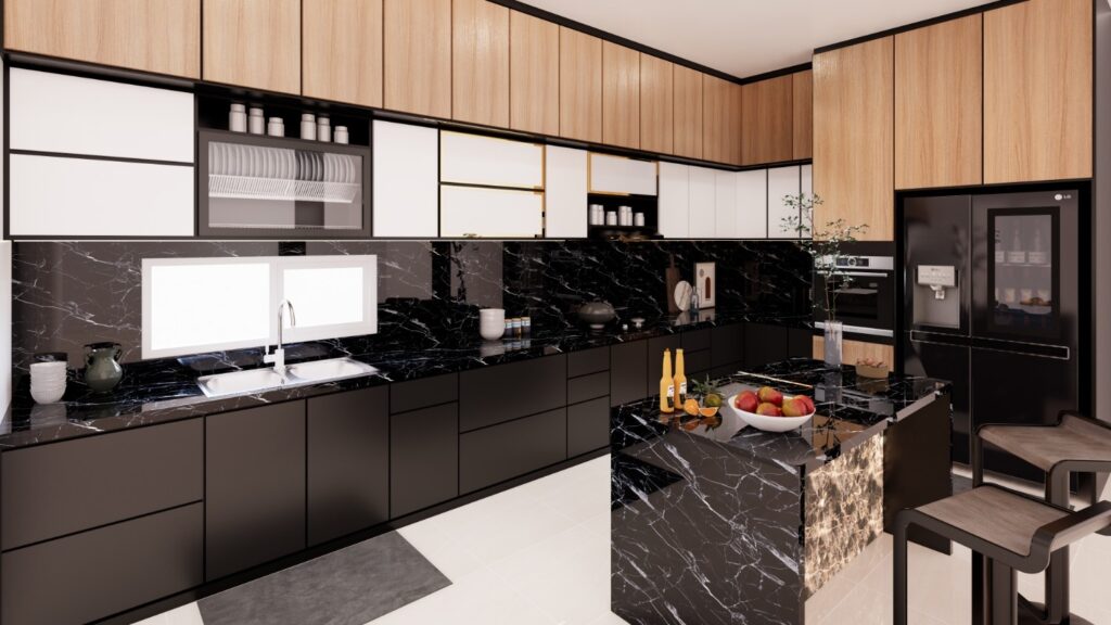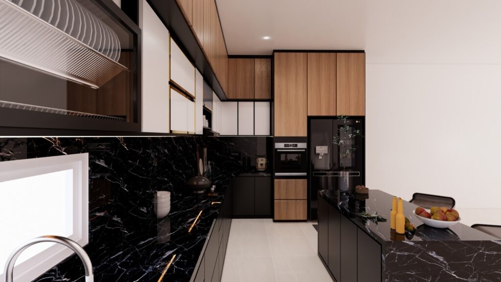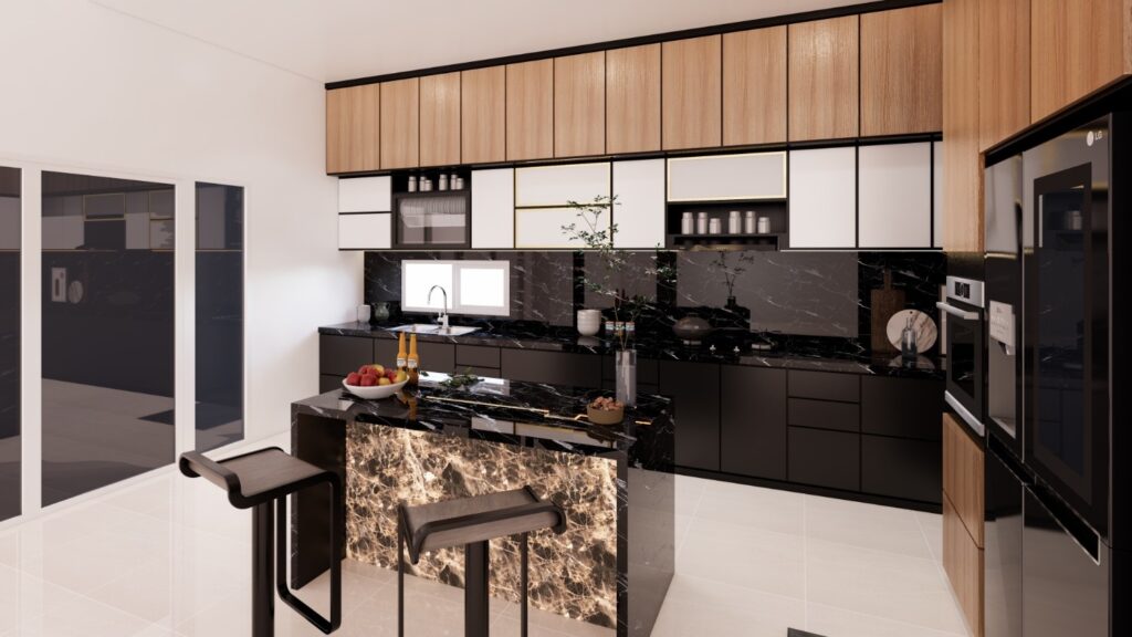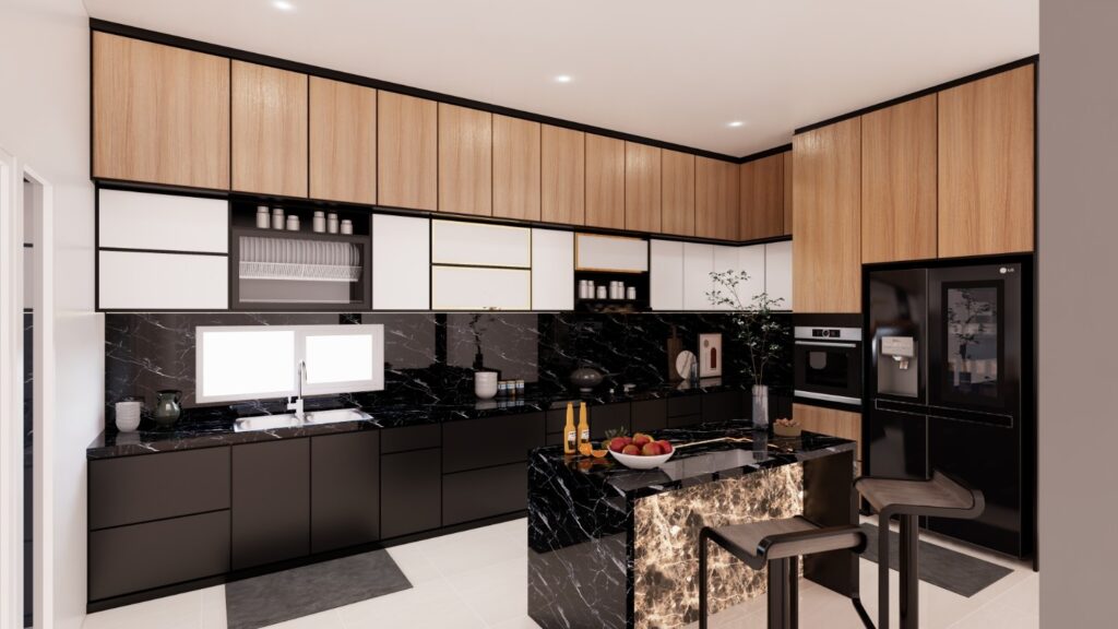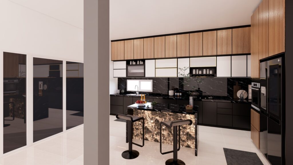 Kitchen set ini mengusung konsep Modern Kontemporer yang mewah dengan permainan kontras material yang kuat antara tekstur kayu alami dan dominasi warna hitam yang elegan. Fokus utama terletak pada penggunaan marmer hitam bermotif dramatis serta aksen pencahayaan backlit pada kitchen island yang menciptakan titik fokal (focal point) yang estetik dan hangat. Secara fungsional, dapur ini memaksimalkan efisiensi ruang melalui kabinet full-height yang rapi serta integrasi perangkat elektronik secara seamless untuk mendukung gaya hidup urban yang praktis.