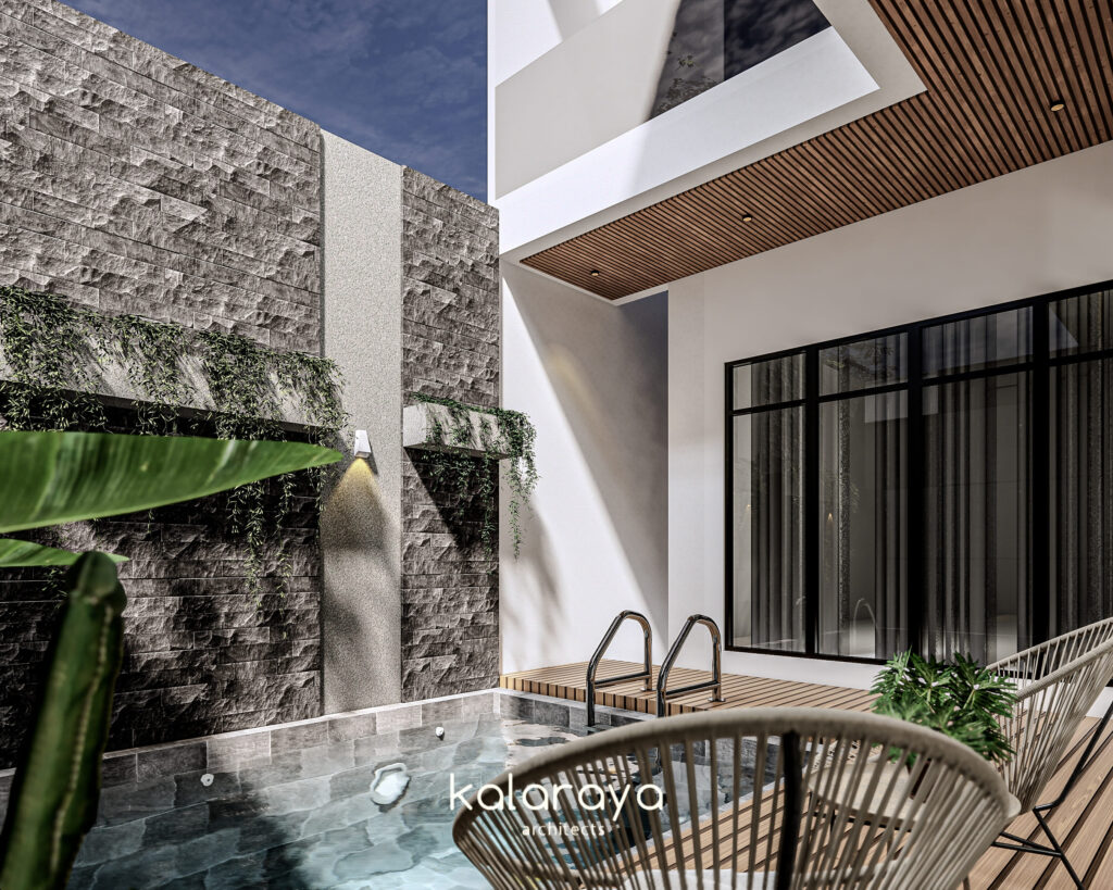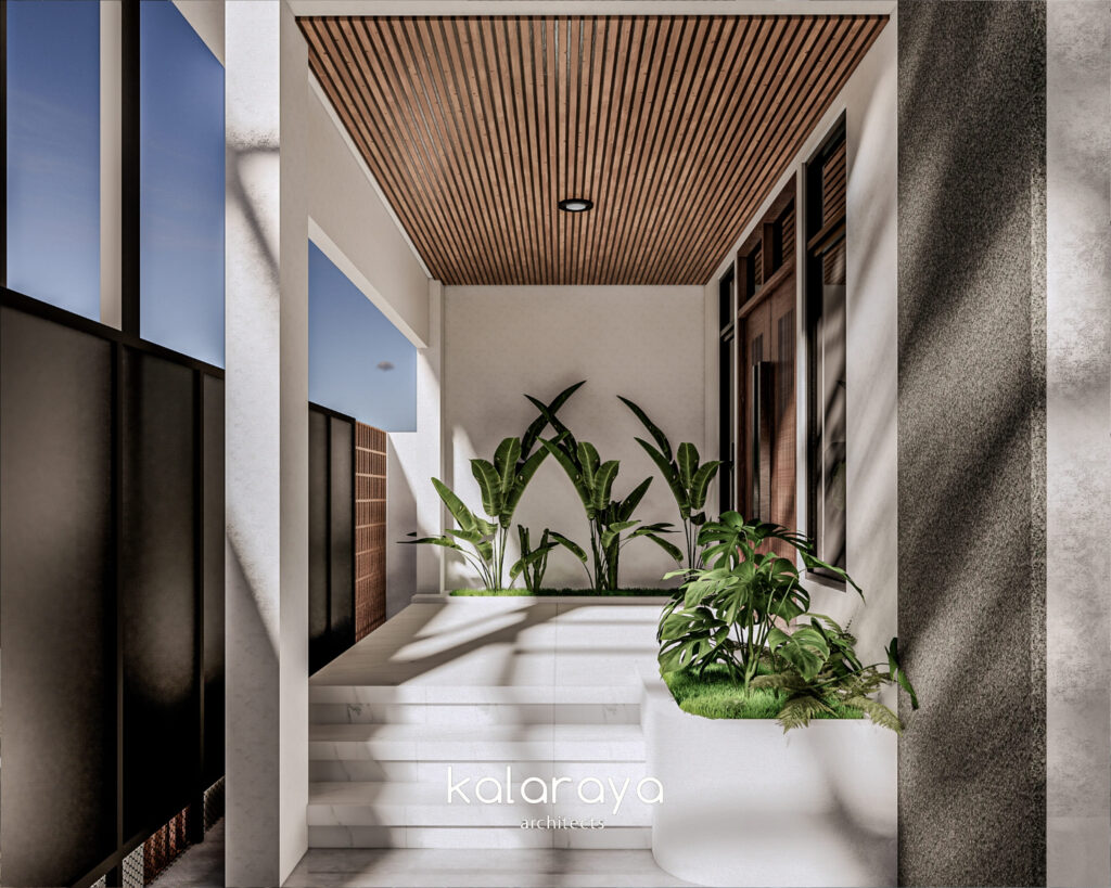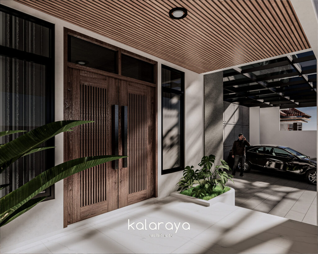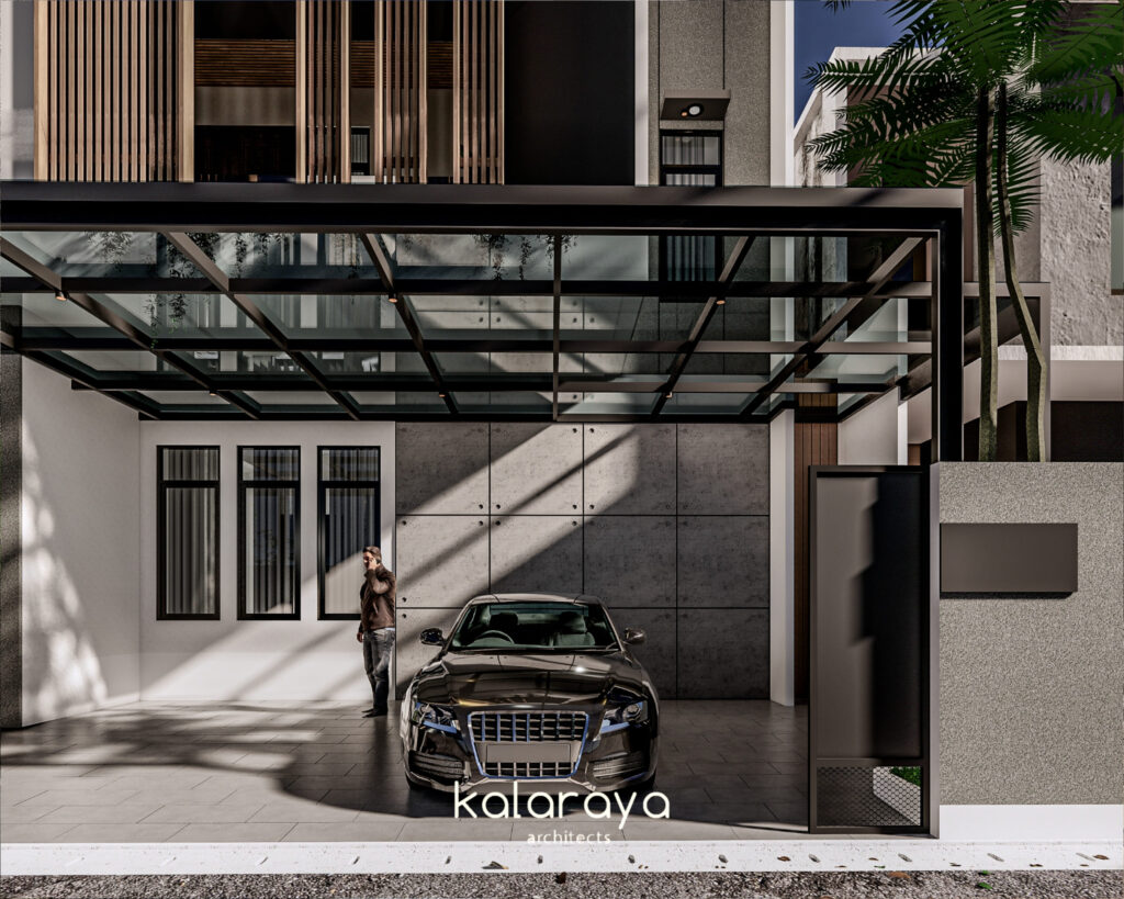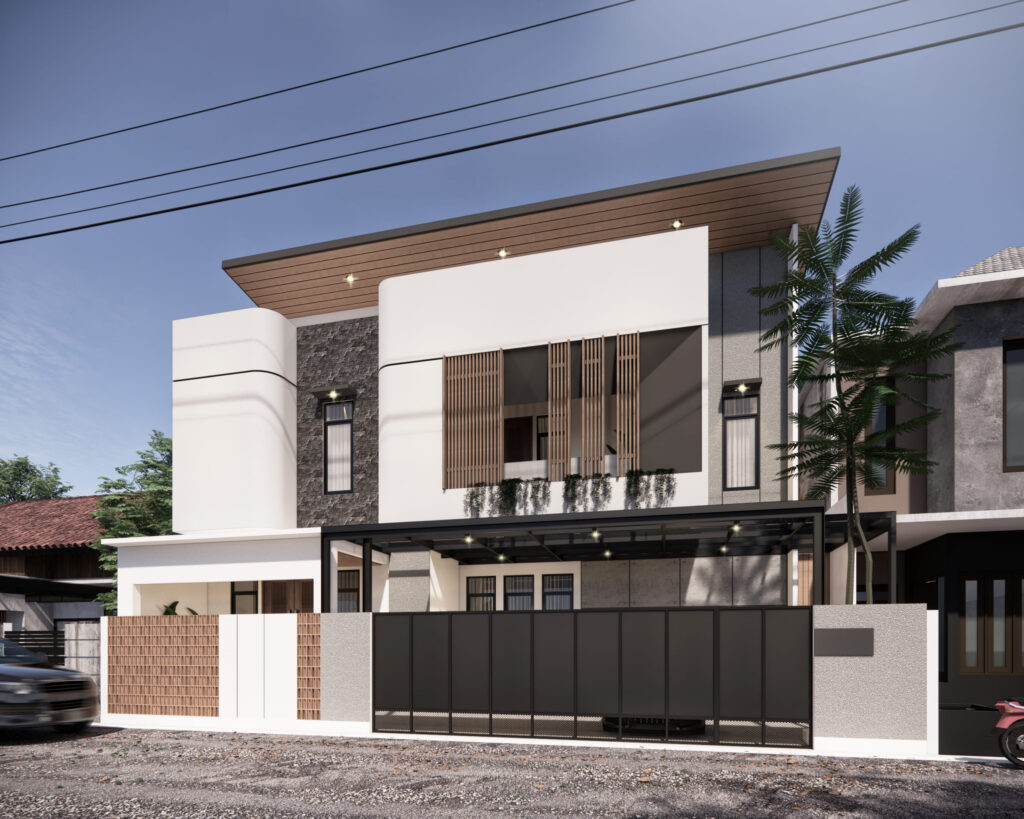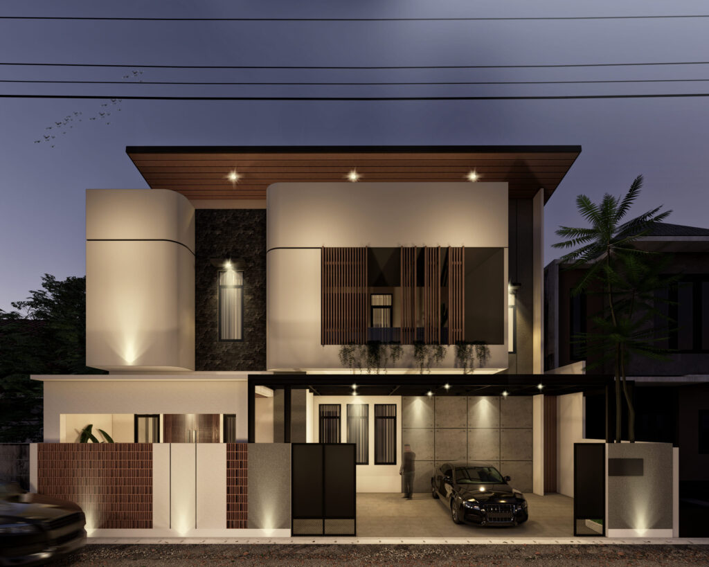 Desain rumah tinggal ini mengusung konsep Modern Kontemporer dengan pendekatan fasad yang dinamis melalui permainan massa bangunan berbentuk lengkung (curved) dan penggunaan secondary skin kayu untuk mereduksi panas matahari. Kombinasi material alam seperti batu alam gelap, bata roster, dan beton ekspos memberikan tekstur yang kaya sekaligus memperkuat karakter bangunan yang kokoh namun tetap hangat. Secara fungsional, integrasi tanaman pada fasad dan area terbuka di lantai bawah menciptakan sirkulasi udara yang baik, selaras dengan kebutuhan hunian di iklim tropis yang padat.