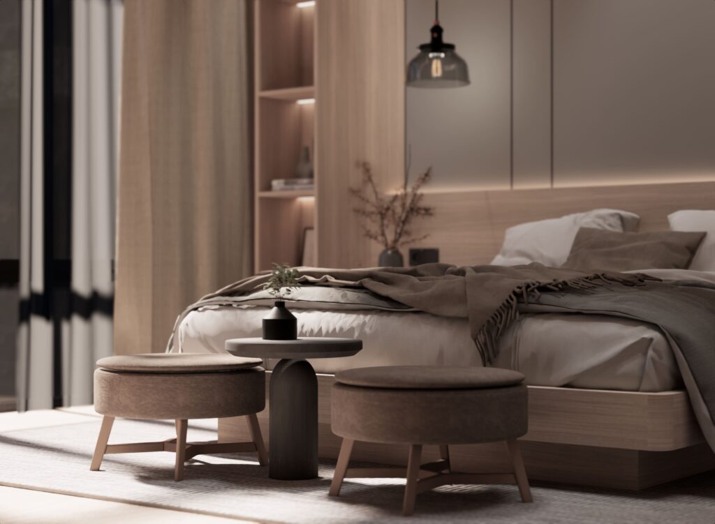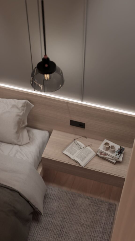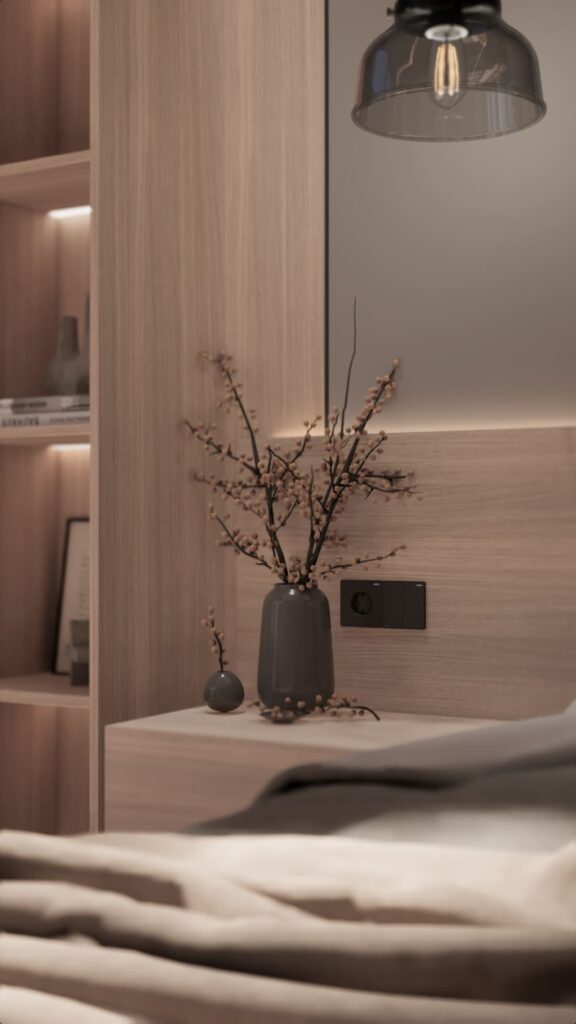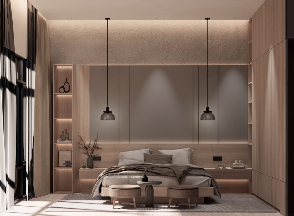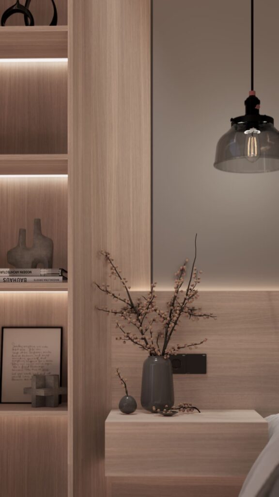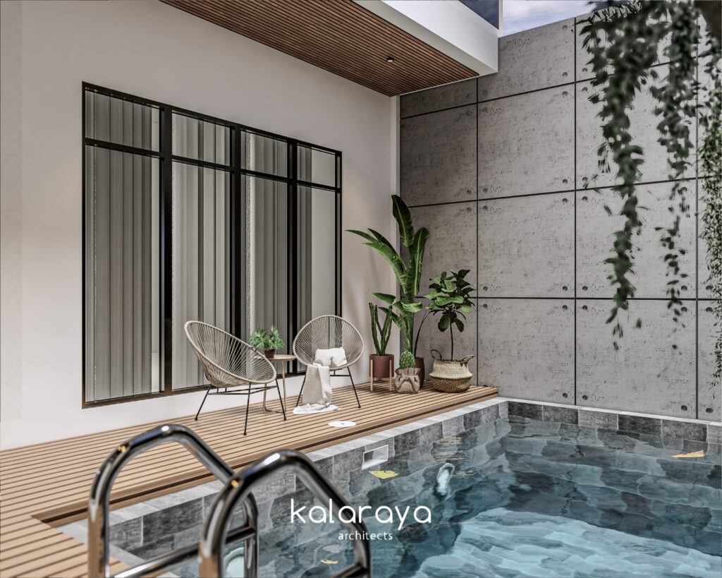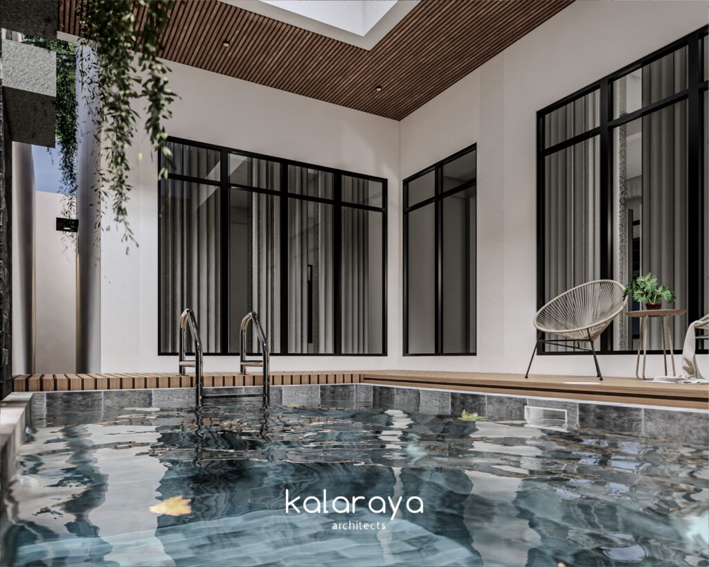 Desain rumah tinggal ini mengusung konsep Modern Kontemporer dengan pendekatan fasad yang dinamis melalui permainan massa bangunan berbentuk lengkung (curved) dan penggunaan secondary skin kayu untuk mereduksi panas matahari. Kombinasi material alam seperti batu alam gelap, bata roster, dan beton ekspos memberikan tekstur yang kaya sekaligus memperkuat karakter bangunan yang kokoh namun tetap hangat. Secara fungsional, integrasi tanaman pada fasad dan area terbuka di lantai bawah menciptakan sirkulasi udara yang baik, selaras dengan kebutuhan hunian di iklim tropis yang padat.