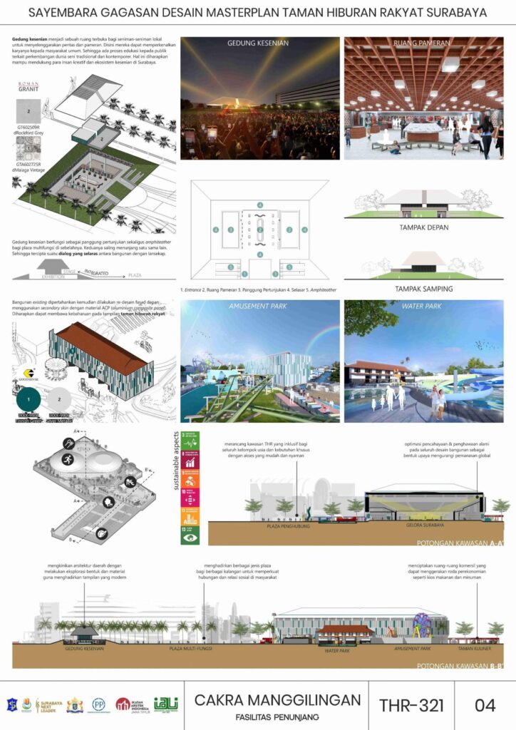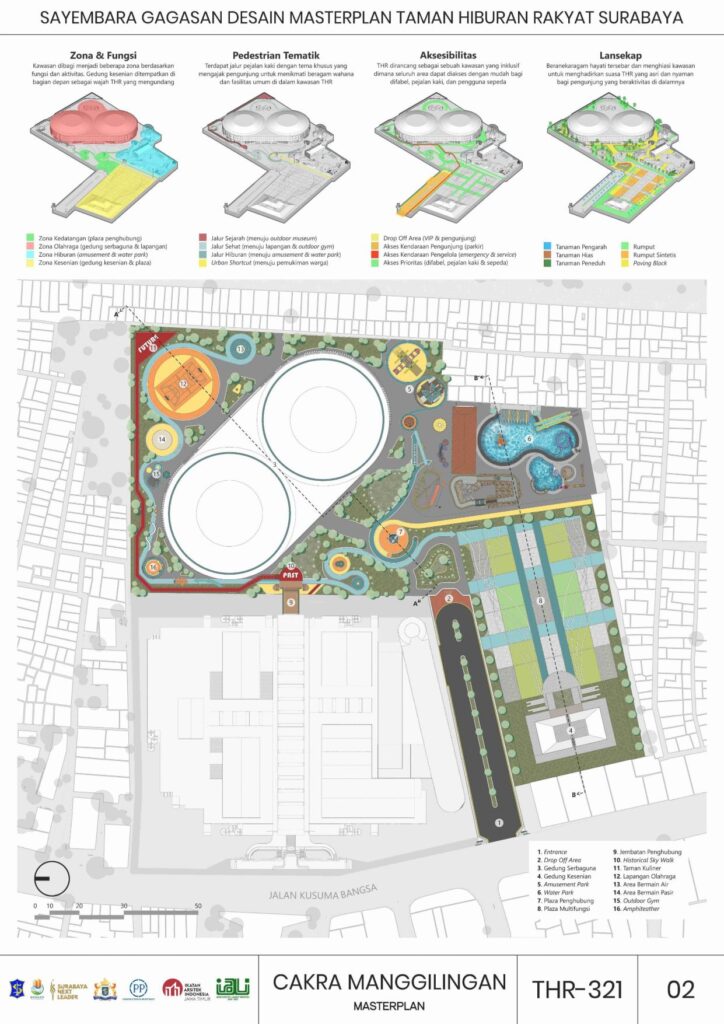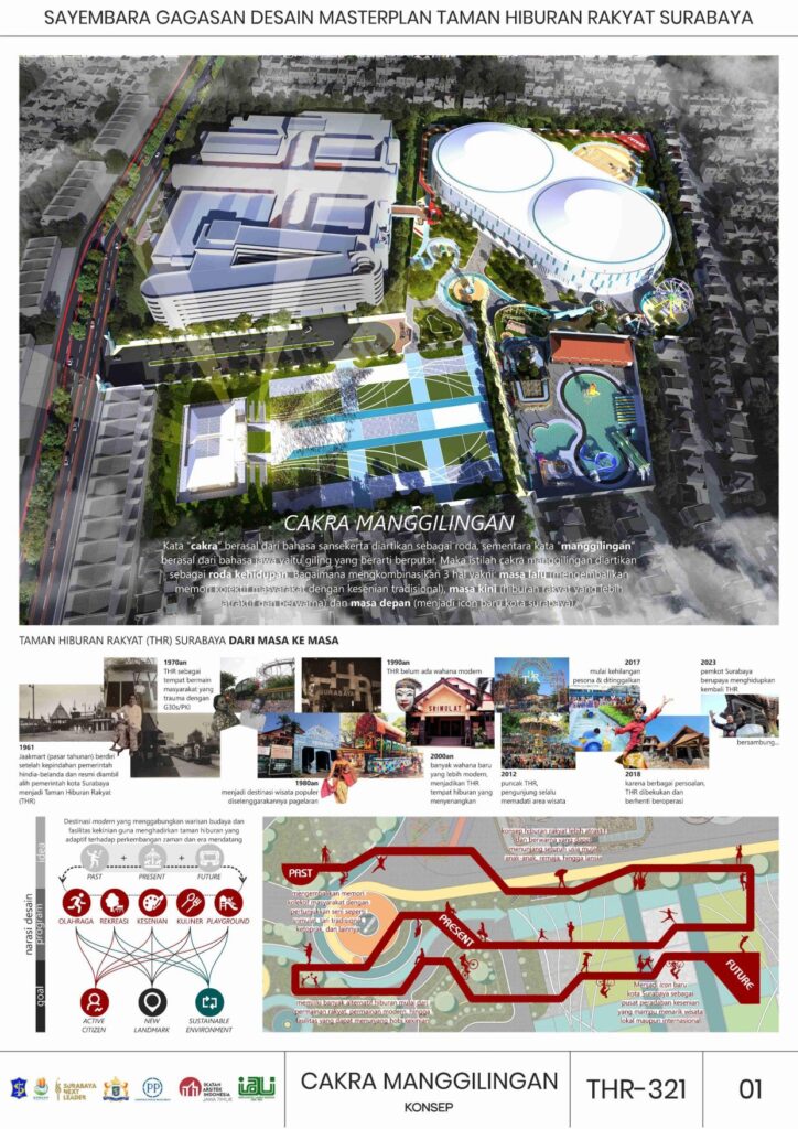 Melalui perancangan masterplan baru ini, diharapkan CAKRA MANGGILINGAN: Taman Hiburan Rakyat Surabaya dapat kembali menjadi jantung aktivitas sosial dan budaya Kota Surabaya. Konsep past-present-future diangkat sebagai landasan utama desain, menghadirkan kesinambungan antara sejarah, kebutuhan masa kini, dan visi masa depan. Elemen-elemen yang menyimpan nilai historis dipertahankan dan direinterpretasi, sementara fasilitas baru dirancang lebih adaptif, inklusif, dan relevan dengan perkembangan zaman.