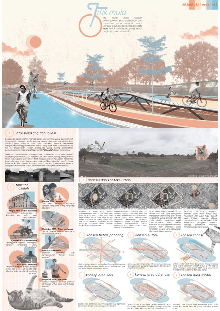 Konsep “Titik Mula” hadir sebagai jawaban atas kebutuhan tersebut. Titik Mula dirancang sebagai ruang berkumpul bagi para pesepeda dan komunitas sebuah hub yang tidak hanya berfungsi sebagai titik awal dan akhir perjalanan, tetapi juga sebagai pusat rekreasi, edukasi, dan interaksi sosial. Di dalamnya terdapat fasilitas pendukung seperti area istirahat, ruang diskusi komunitas, bengkel sepeda, hingga ruang edukasi keselamatan berlalu lintas.