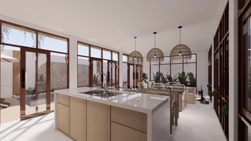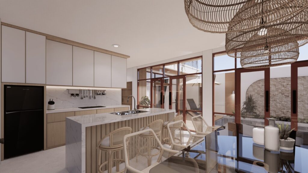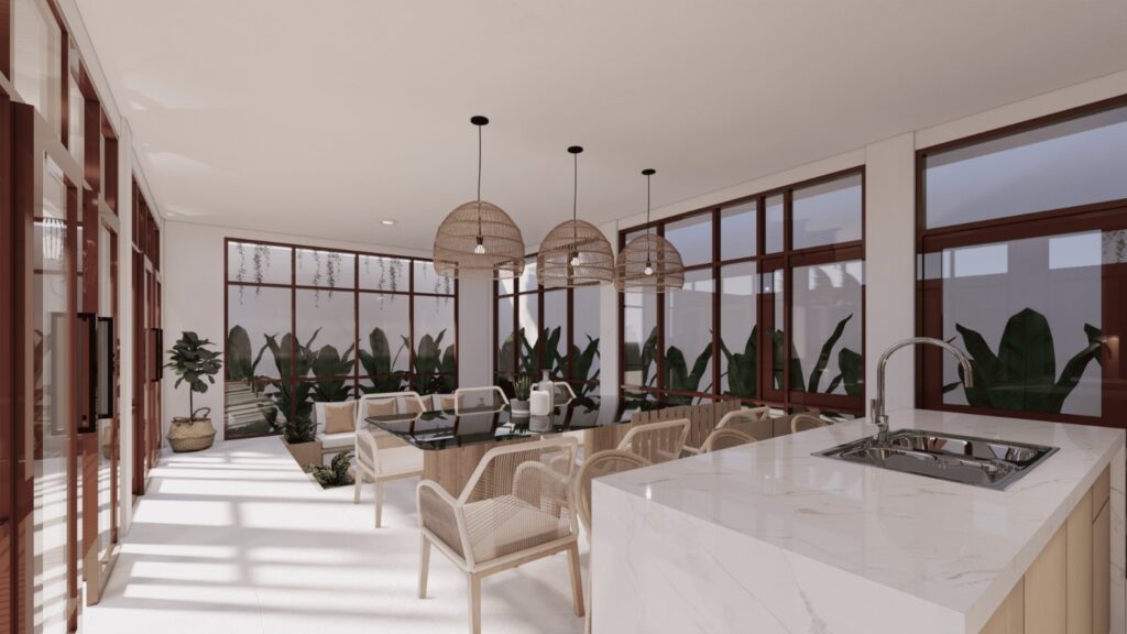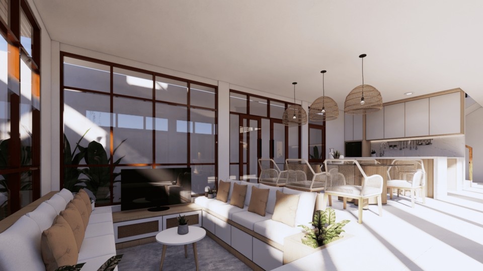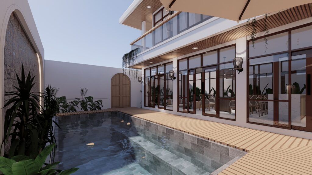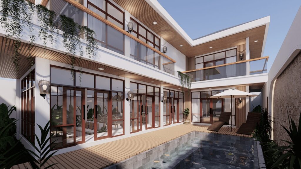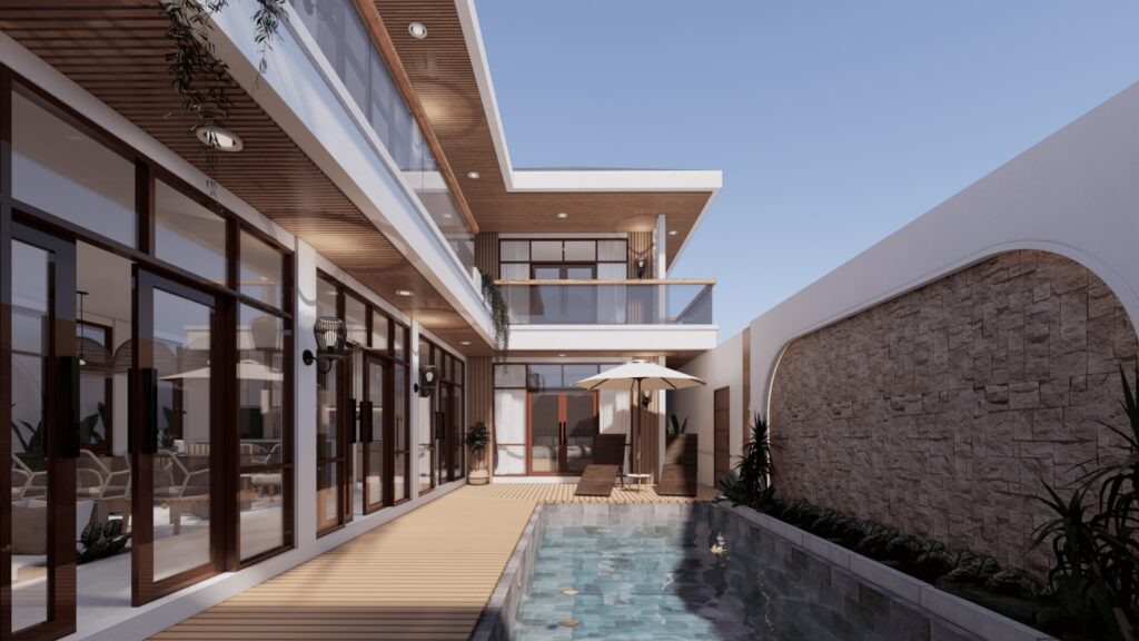 Villa ini mengusung konsep tropical contemporary dengan bentuk modern yang bersih dan proporsi yang tegas. Penggunaan material alami seperti kayu, vegetasi, dan bukaan lebar menciptakan suasana hangat serta mendukung pencahayaan dan penghawaan alami. Desainnya menekankan privasi dari luar namun tetap terasa terbuka dan nyaman di dalam, sesuai dengan karakter hunian tropis.