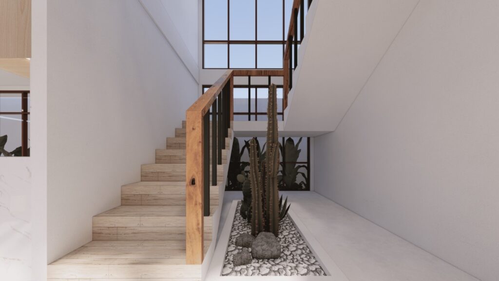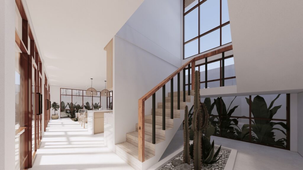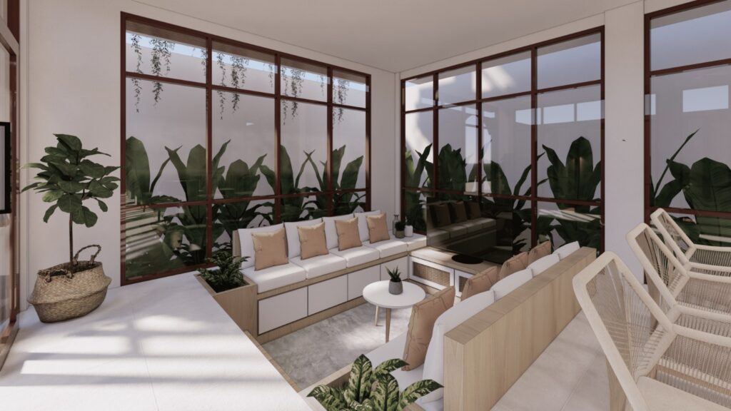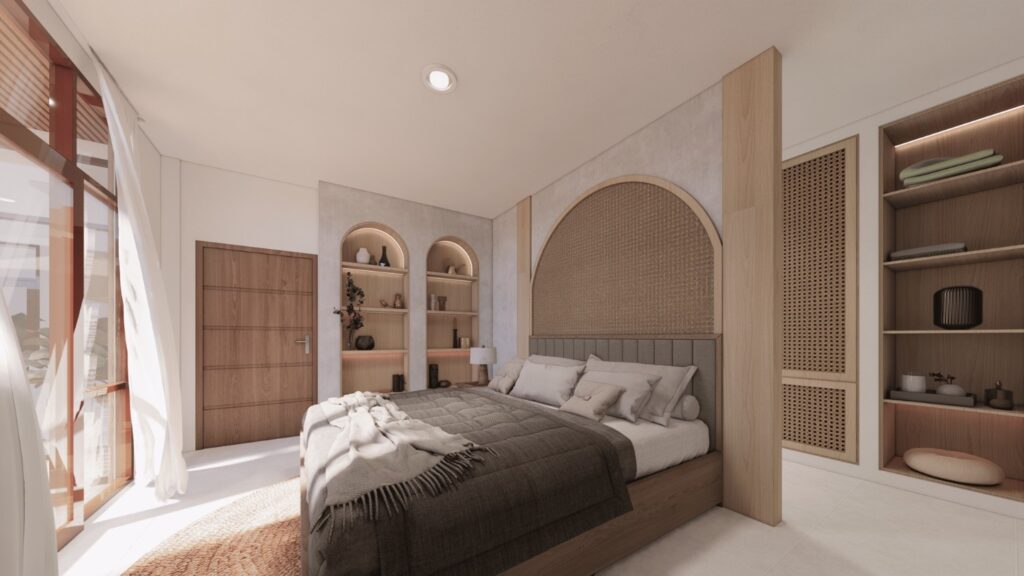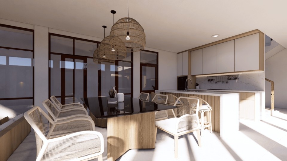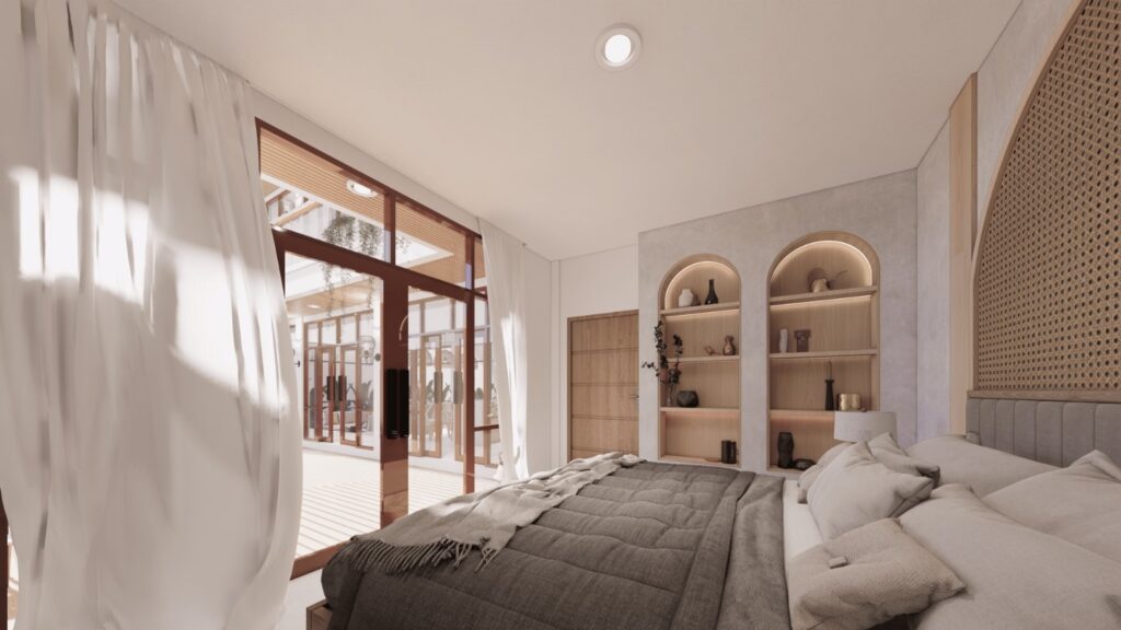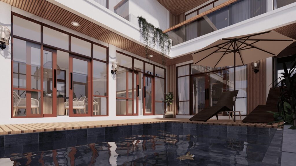 Villa ini mengusung konsep tropical contemporary dengan bentuk modern yang bersih dan proporsi yang tegas. Penggunaan material alami seperti kayu, vegetasi, dan bukaan lebar menciptakan suasana hangat serta mendukung pencahayaan dan penghawaan alami. Desainnya menekankan privasi dari luar namun tetap terasa terbuka dan nyaman di dalam, sesuai dengan karakter hunian tropis.